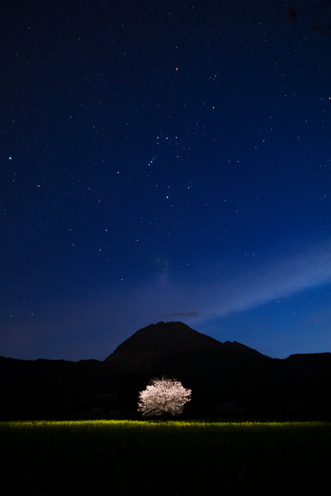 平成に噴火した普賢岳災害によってこの地まで流れ出た火砕流。令和の時代には綺麗な花が咲く公園に生まれ変わっています。この桜は一面の菜の花畑の真ん中に植えられこの公園のマスコット的な桜になっています。