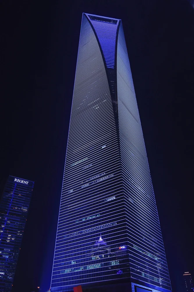 金茂大厦の後に上海で一番の高層建築となった通称栓抜きビルと呼ばれた森ビル(上海環球金融中心)。101階建てで、筋骨質な金茂大厦とは対照的な緩やかな曲線美を取り入れた流れる様なデザインのビルです。この日はブルーのライトアップでした。