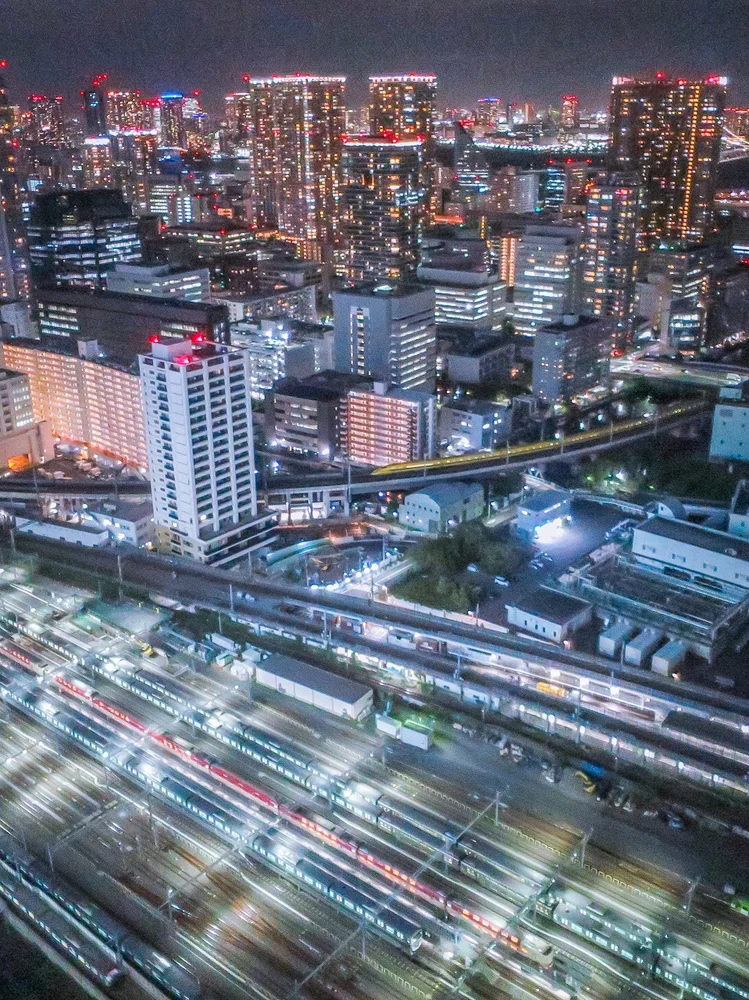 昨日に引き続き28Fからの撮影です。回送線を車両基地に向かうドクターイエローです。手前の車両基地にはサンライズが留置されていました。 18:11