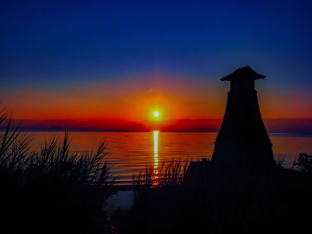 *琵琶湖畔にある「木津(こうつ)港跡」は、かつて湖上交通で賑わった港でしたが、現在は常夜灯が残るのみで史跡となっている所です。 この日の朝は、そのシルエットと、遙か対岸に見える霊峰伊吹山の右肩辺りから昇る御来光とのコラボレーションです。 更に画面左には竹生島が沖合に見え、湖面付近をアオサギが飛んできたところを(小画面では判り難いですが)撮影しました。