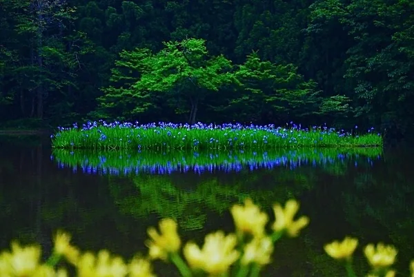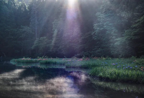 箱舘山の山間にある天然の湿原「平池(だいらいけ)」に野生のカキツバタが群生し、青紫の花が映える幻想的な光景です。 早朝からの冷え込みで池には朝靄が立ち無風で極めて静寂でした。 そして、日が昇る頃、樹間からは陽光がスポットライトのようにカキツバタの群生する所に射しはじめ、朝靄の中に浮き出したカキツバタの花の色と背景の深緑が、鏡と化した水面に倒影されて極めて美しく絶景でした。