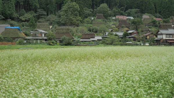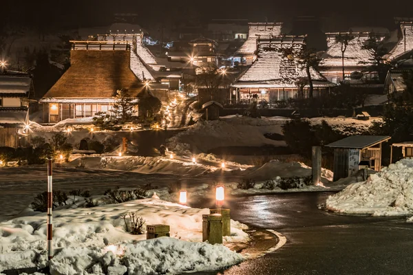 雪に埋もれる茅葺屋根の集落