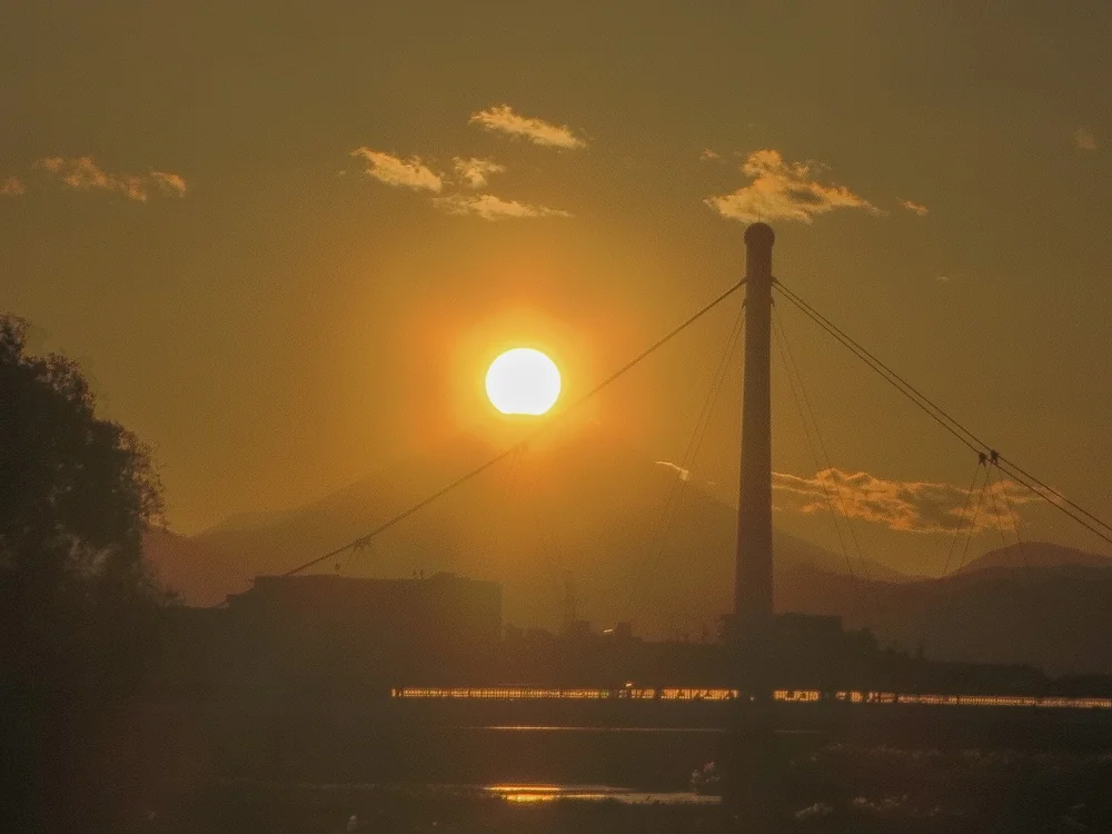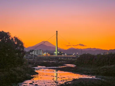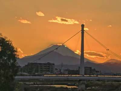 富士山の形の吊り橋とダイヤモンド富士のコラボです。蛇行する川も夕焼けに染まりました。 16:11