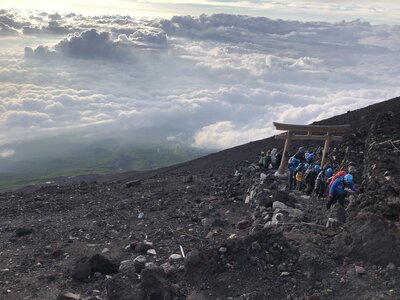 富士山スカイラインの夜は濃霧に覆われ、霧が晴れるとすべての木々に霧氷が付いて真っ白になっていました。朝は、雲もなくなり富士山の姿もくっきり見えました。この冬は暖冬のため、とても雪が少ない富士山です。