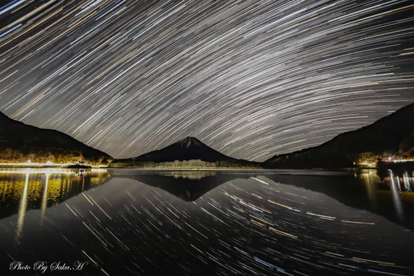 精進湖畔にて撮影 ここでは、富士山の手前では寄生火山である大室山がそびえている。 富士山が大室山を抱きかかえているように見えることから、「子抱富士」とも言う。