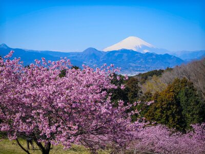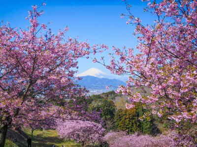 見頃の河津桜と化粧直しした富士山が雲一つない青空に映えます。