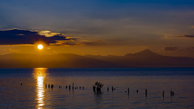 未明の琵琶湖畔にて、暗闇の深いブルーから、次第に明けゆく伊吹山から連なる湖東の山々の稜線と空の色とのグラデーションが美しく、そして上空には明けの明星「金星」と「二十六夜月」とのコラボレーションが絶景です。
