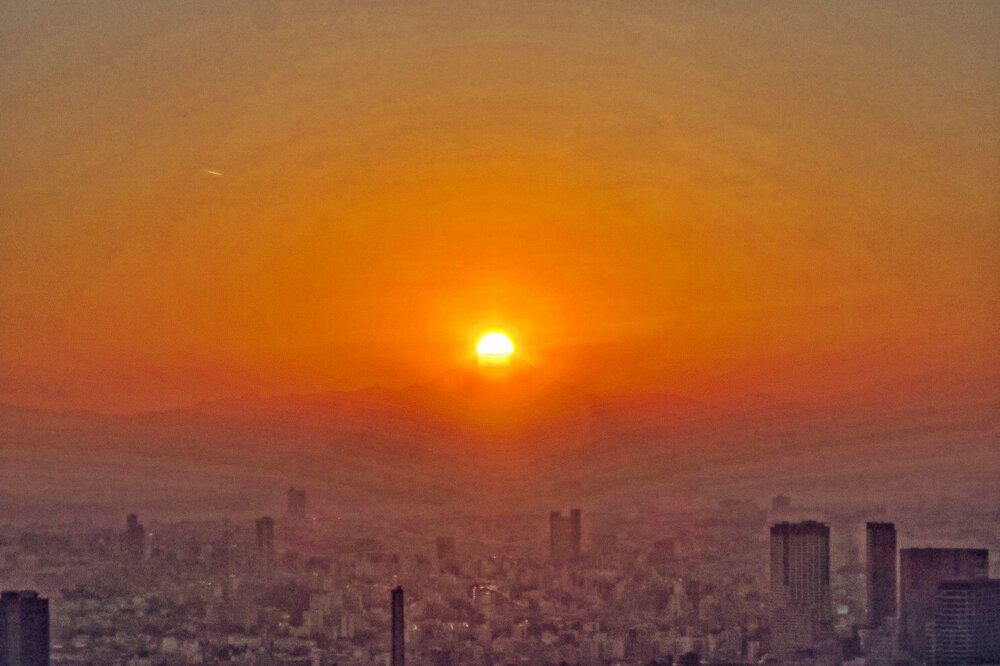 屋上スカイデッキは休業中のため屋内になりました。スモッグに近い酷い霞のためダイヤモンド富士が始まるまで富士山は見えませんでした。窓ガラスの影響で夕日がダブります。