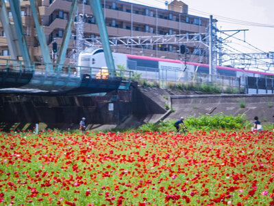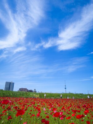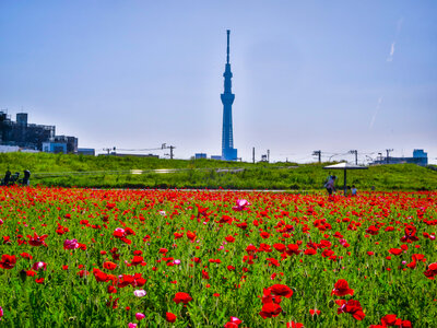 夕焼け空を背景に、三日月と東京スカイツリーが輝いていました。