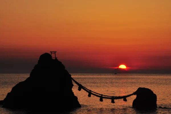 三重県伊勢市にある夫婦岩(二見興玉神社)と朝日のコラボです。 ここは有名な観光スポットで多くの方が訪れますが、この日も早朝から朝日を見ようとたくさんの人がおられました。 岩を結ぶ縄は年3回張り替えされているそうです。