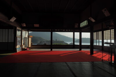 福山市立大学近くの駐車場から見える日の出。 春と秋に港の先から日の出が始まる。 港の周りの建物が朱く染まる一瞬です。
