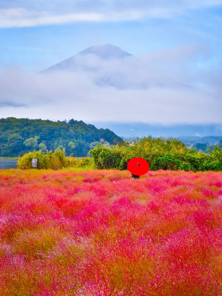 色付いたコキアと雲間の富士山