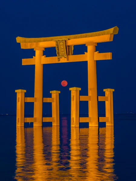 滋賀県琵琶湖のパワースポット、白鬚神社の湖中鳥居を中心にした夜明け前の風景です。シャッター速度1/1.3秒×189回の比較明合成で撮影し、波が全く無いかのような静寂感の中に鳥居が浮かび上がり、その影が湖面に映る幻想的な光景です。