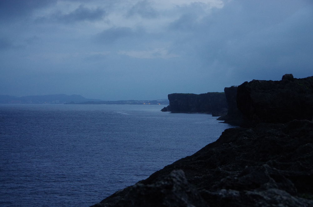 沖縄本島にある人気の夕日スポットのひとつ「残波岬」 この日は残念ながら曇りでしたが、日が暮れてきて薄暗い中、岬の断崖がなんともいえない雰囲気で撮影できました。 眼下の海を見ているとなんとカツオが跳ねました!