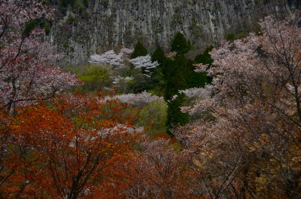 奈良県宇陀郡曽爾村は村の大半を占める山地が室生火山群に属し、西側に岩肌もあらわな鎧岳、兜岳、屏風岩などの珍しい柱状節理の美景は国の天然記念物に指定されています。屏風岩(標高940m)は兜岳の西側にあり、奇峯がその名のとおりに南面にあたかも屏風を立てたように屹立し、その幅2km、鋸の刃のように鋭くそびえ、垂直に柱状節理の岩壁が約200mの断崖をなしています。春には岩壁のミツバツツジなどが咲き誇り、麓に広がる公苑は樹齢100年を超える300本の山桜が咲き乱れ奈良県で1番最後に咲く桜スポットです。