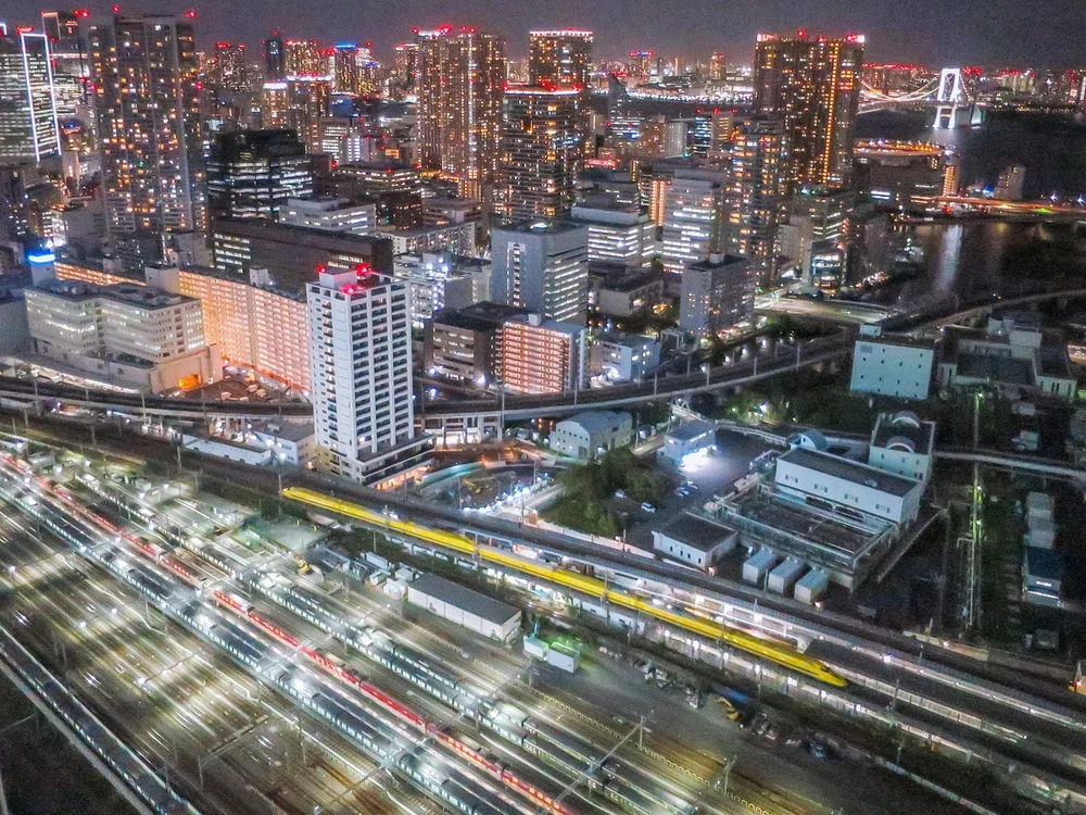 昨日に引き続き28Fからの撮影です。本線を東京駅に向かうドクターイエローです。手前の車両基地にはサンライズ が留置されていました。 17:48