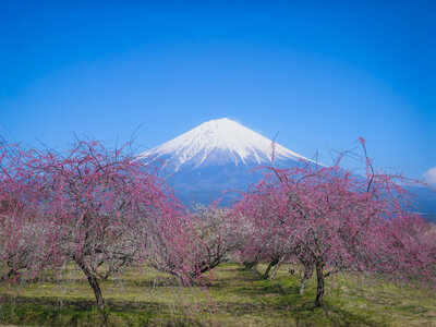 紅白の梅林と化粧直しした富士山