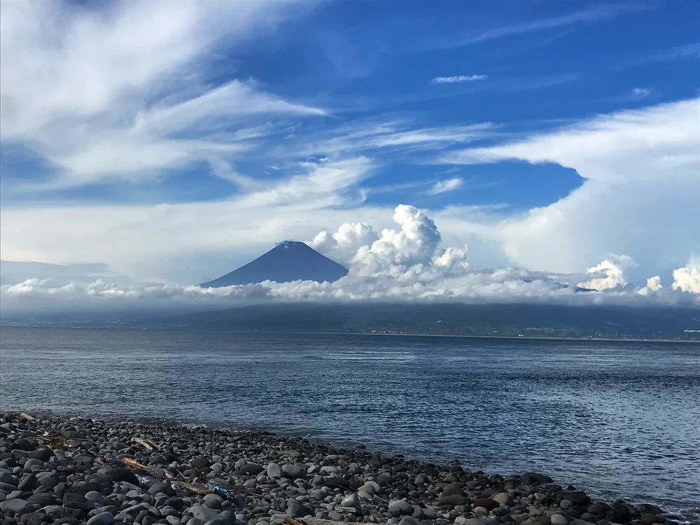 伊豆半島の北西突端、長さ1km最小幅は100m足らずの砂州の半島に真水の神池が湧き上がる大瀬崎から見る富士山。
