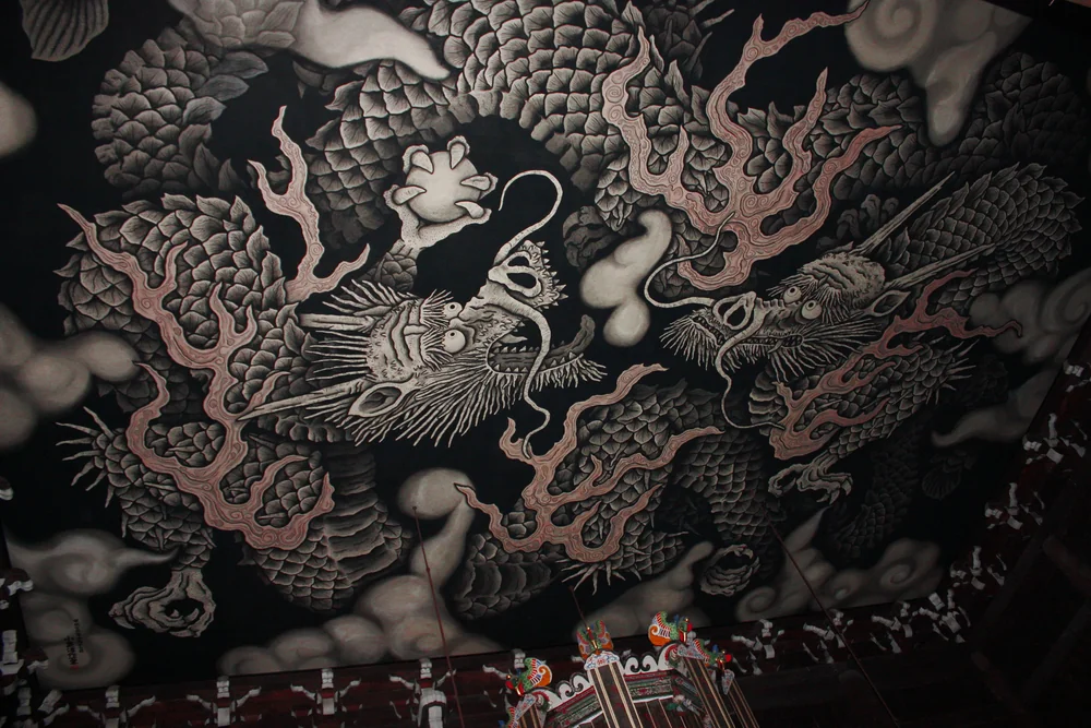 法堂の天井いっぱいに阿吽の口をした2匹の龍が描かれる。阿形の龍は手に玉をつかむ。仏法守護として、また水の神として仏法の教えの雨(法雨)を降らせるたとえから、禅宗の法堂に描かれることが多い。建仁寺法堂は古くより龍は描かれず素木(しらき)とされてきたが、建仁寺創建800年を記念して平成14年(2002)4月に小泉淳作画伯の筆により完成したものである。 (HPより抜粋)
