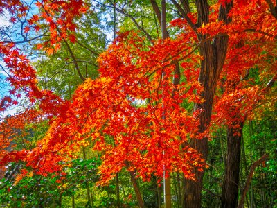 もみじの紅葉と水枯れの小川を埋める落ち葉