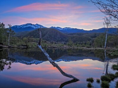 まいめの池に写る夕焼け雲と残雪の乗鞍岳