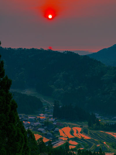 畑の棚田を見下ろす基幹林道の上部から、湖西の山を前景に琵琶湖越しに見る御来光です。 対岸の稜線上にある春霞の層は厚く、なかなか太陽は姿を現しませんでしたが、霞の中からボワッと浮き上がるように真っ赤な太陽が昇ってきて、微かに湖面を照らしている幻想的な光景でした。