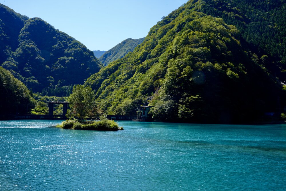 ダイヤモンド富士が崩れてしまい、温泉で気を紛らわせようと奈良田湖へ。 そこには美しい青い水を湛えたダム湖でした。。