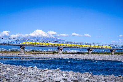 冬晴れの青空の下、富士川を渡ります。化粧直しの済んだ富士山もクリアーに見えていました。