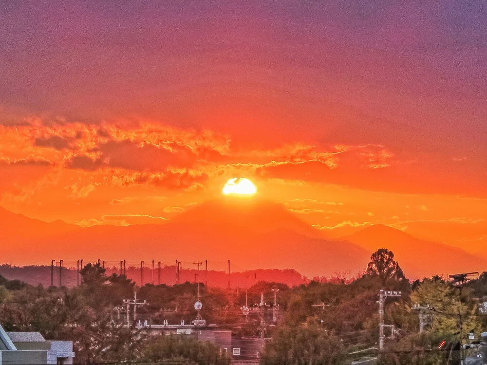 国分寺崖線の上の見晴らしの良い高台からです。初めての場所で写友に教えてもらいました。雲が多かったですが、富士山の上に隙間ができ無事ダイヤモンド富士が撮れました。市街地も紅葉が進んでいます。 16:20