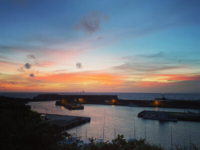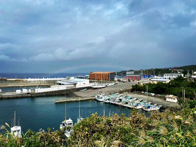 台風接近に伴い、漁港内の船がロープで養生されています。