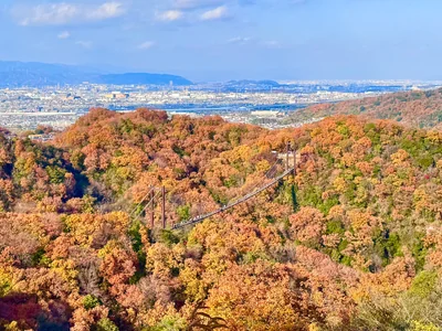 府政100年を記念して、金剛生駒紀泉国定公園の豊かな自然に親しめるよう、大阪府が森林や施設を整備した自然公園(府内全9箇所)。 交野市にあるほしだ園地では、芽吹きから新緑、紅葉から落葉へと雑木林の四季の移ろいを長さ280m、高さ50m、全国最大級の吊橋「星のブランコ」や「森林鉄道風の歩道橋」からの空中散歩の気分で楽しむことができます。また、平成9年なみはや国体の登はん会場となった「クライミングウォール(高さ16.5m 3面のオーバーハング固定壁)」は、近畿各地からの利用者で賑わいを見せています。その他にも、園地内には様々なハイキングコースがあり、天孫降臨伝説のある「哮が峰」をはじめ多くの巨石が散在し、森林浴やバードウォッチングも楽しめます。 吊り橋を一望出来る展望所からは、遠く京都の天王山や愛宕山も観る事が出来ます。