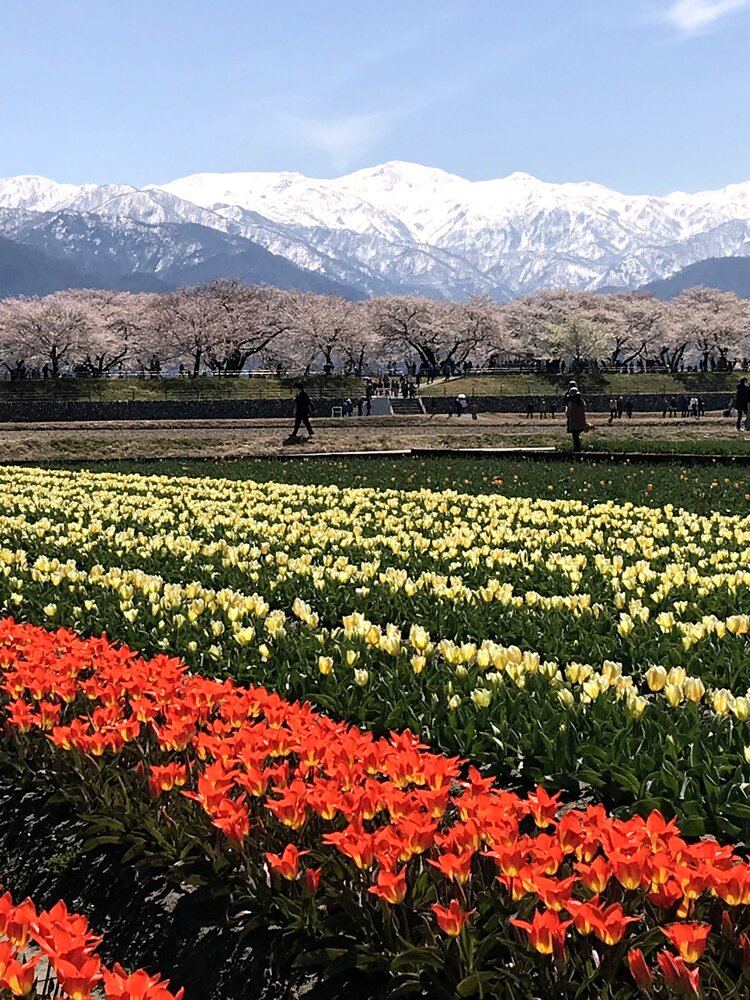 残雪の朝日岳を背景に、桜並木、チューリップと菜の花の絨毯で奏でられる景色。
