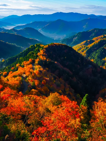 朽木の小入谷(おにゅうだに)集落から福井県へ抜ける林道小入谷線の頂点「小入峠」から約2Km下ったビューポイントから晩秋の朝の光景です。 前日の日中よく晴れて気温が上昇し、夜間から放射冷却で冷え込むと条件次第で谷間には霧が発生し、これが発達して雲海となることがあります。 特に、この頃に見られる紅葉と青空の下に眺める湖西の山並みとのコラボレーションは見事で、滋賀県高島市が誇る絶景です。