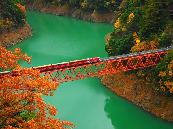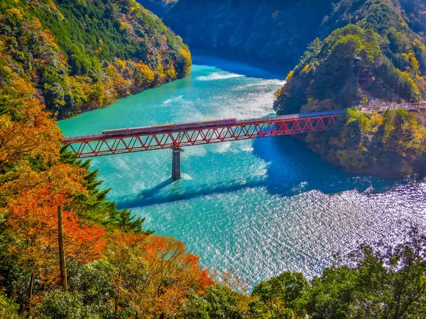 秋の湖上駅に停車中の井川線の列車とレインボーブリッジ全景