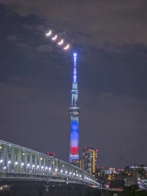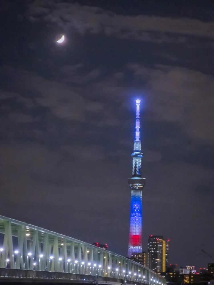 GPVは曇り予報でしたが、18時頃のライブカメラでは青空が広かったので、前夜のリベンジを目指しました。薄雲がありましたがリベンジ成功です。前夜に続き、スカイツリーはトランプ大統領の訪日を受け、星条旗をイメージした特別ライティングです。 ① 19:41
