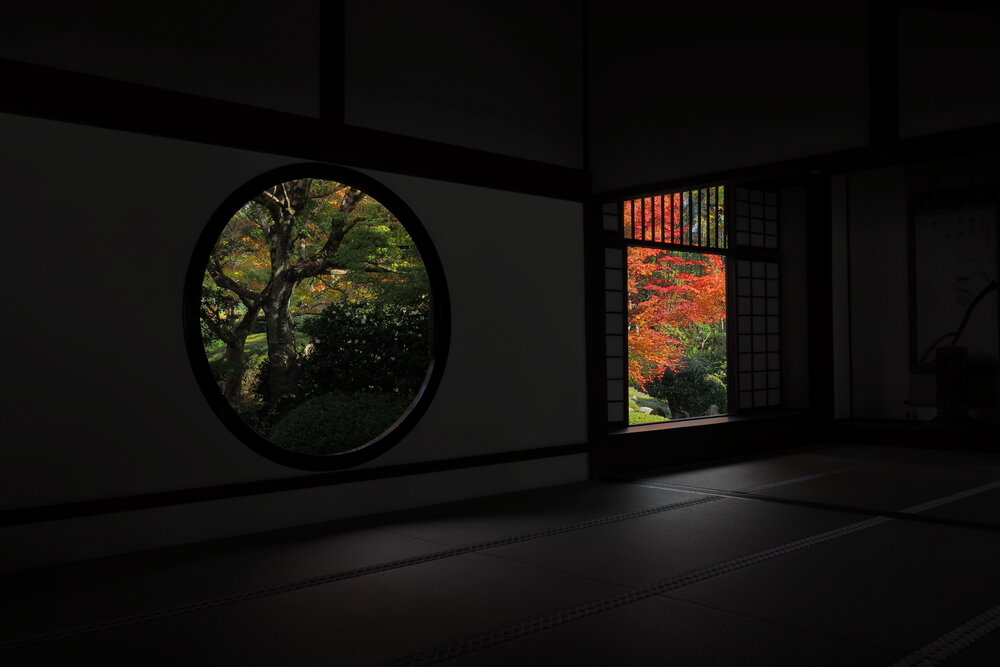 源光庵方丈にある「悟りの窓」、「迷いの窓」 「悟りの窓」は宇宙を表す円の形を成す。 「迷いの窓」は人の生涯を表しているとか。