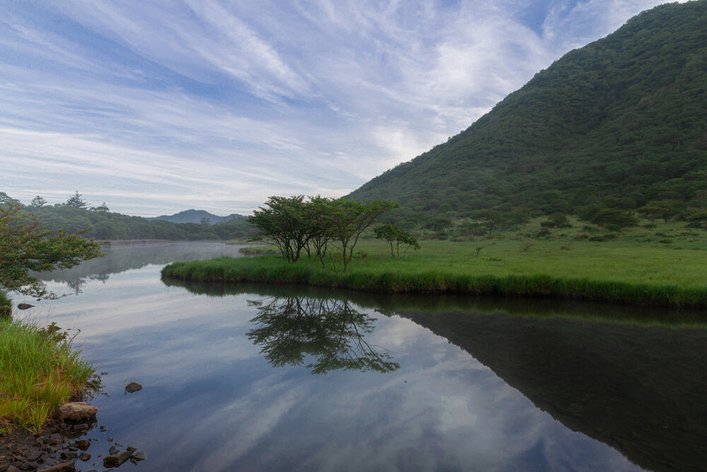 もう一枚覚満淵です。 太陽が登って靄も晴れてしまったので雲の形を生かして撮影しました。