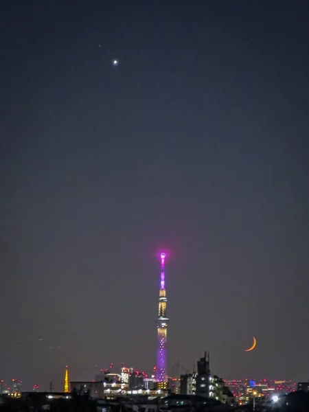 マジックアワーの金星・四日月・スカイツリー・東京タワー