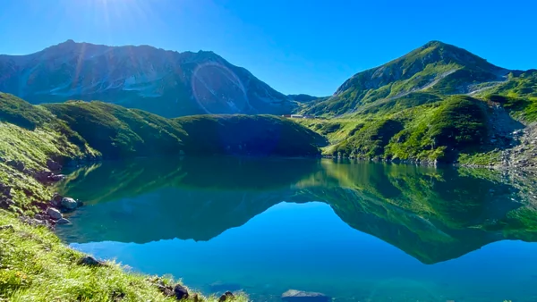 約1万年前にできた周囲約630m、水深約15mの火山湖で、その美しい姿から、北アルプスで最も美しい火山湖といわれています。 立山信仰で「ミクリ」という名は「御厨」と書き、「神の厨房」という意味を持っていす。この「御厨ヶ池」の水が立山権現に捧げられ、この水を使って立山権現に捧げる料理が作られたからです。 例年6月までは深い雪で覆われていますが、7月から10月は紺碧の湖面に雄大な山々を映し出し、美しい姿を見せてくれます。秋には彩り豊かな紅葉と共に、ため息が出そうなほどの絶景です。